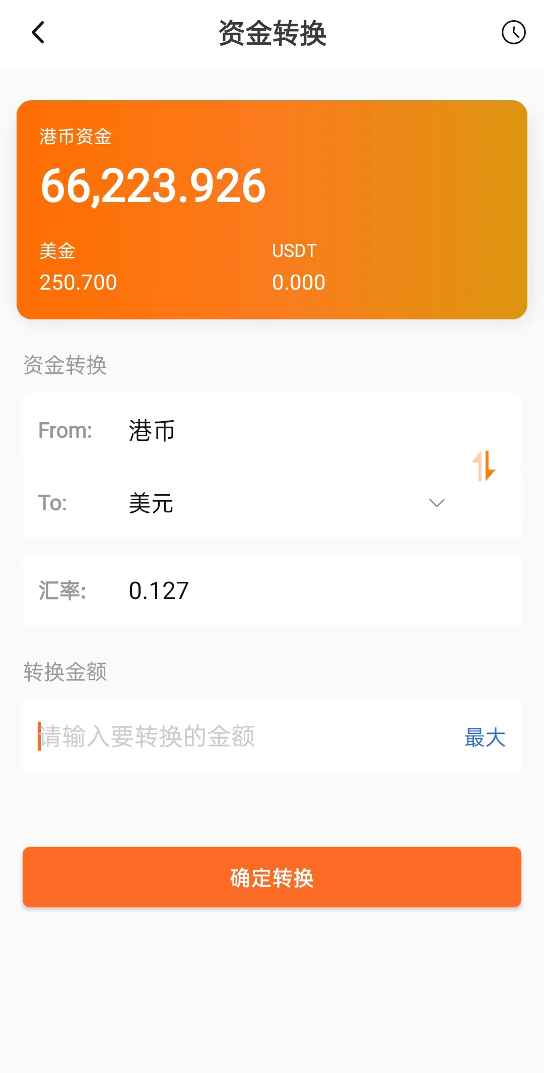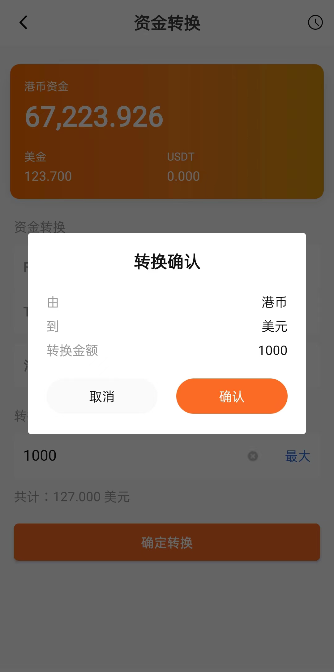 第二步:选择您需要兑换的货币方向例如:港币兑换为美元(如图所示)后输入需要的金额,确认无误后点击“确定转换”