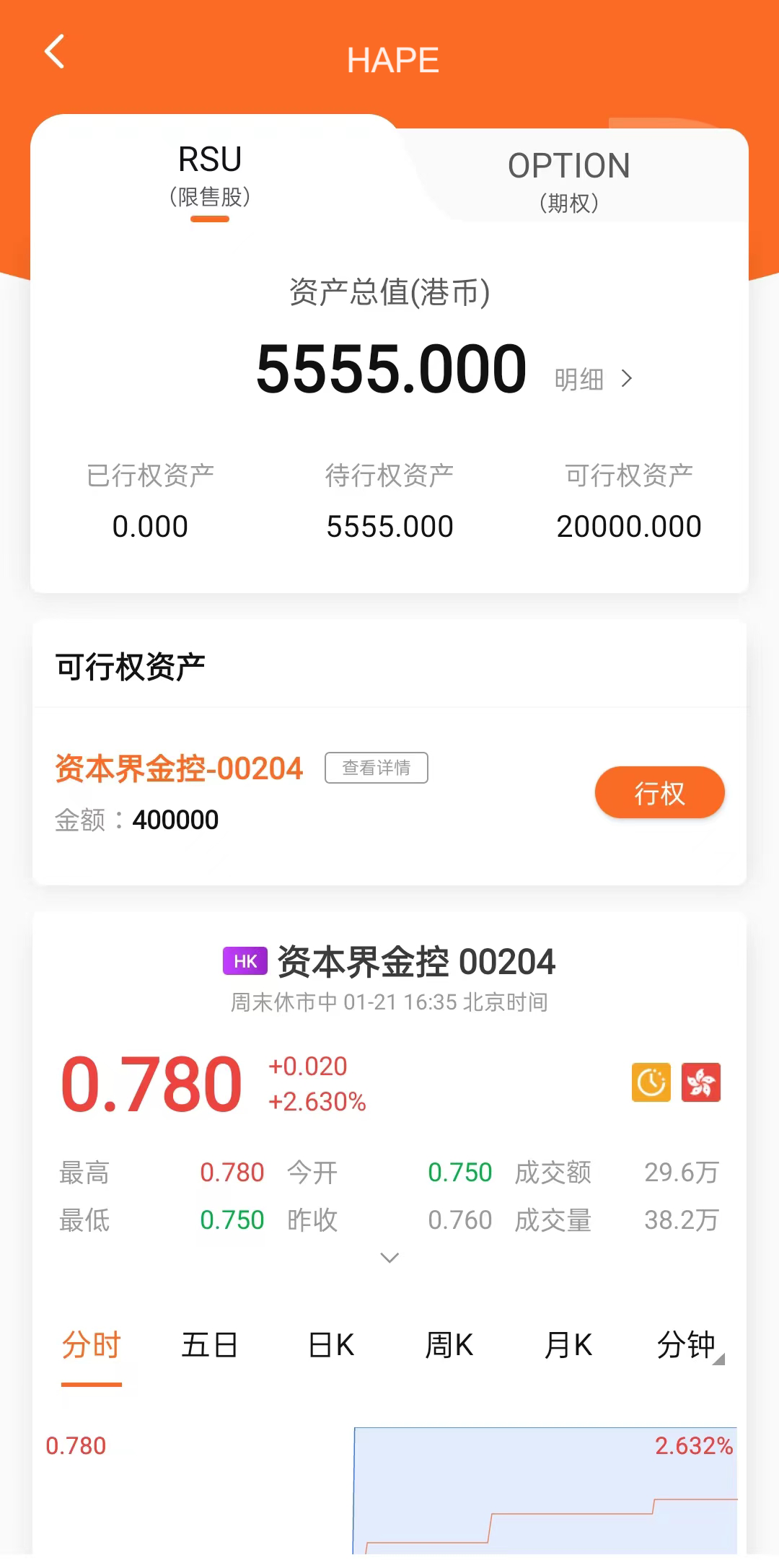 第二步:点击HAPE页面RSU限售股内“行权”按钮;