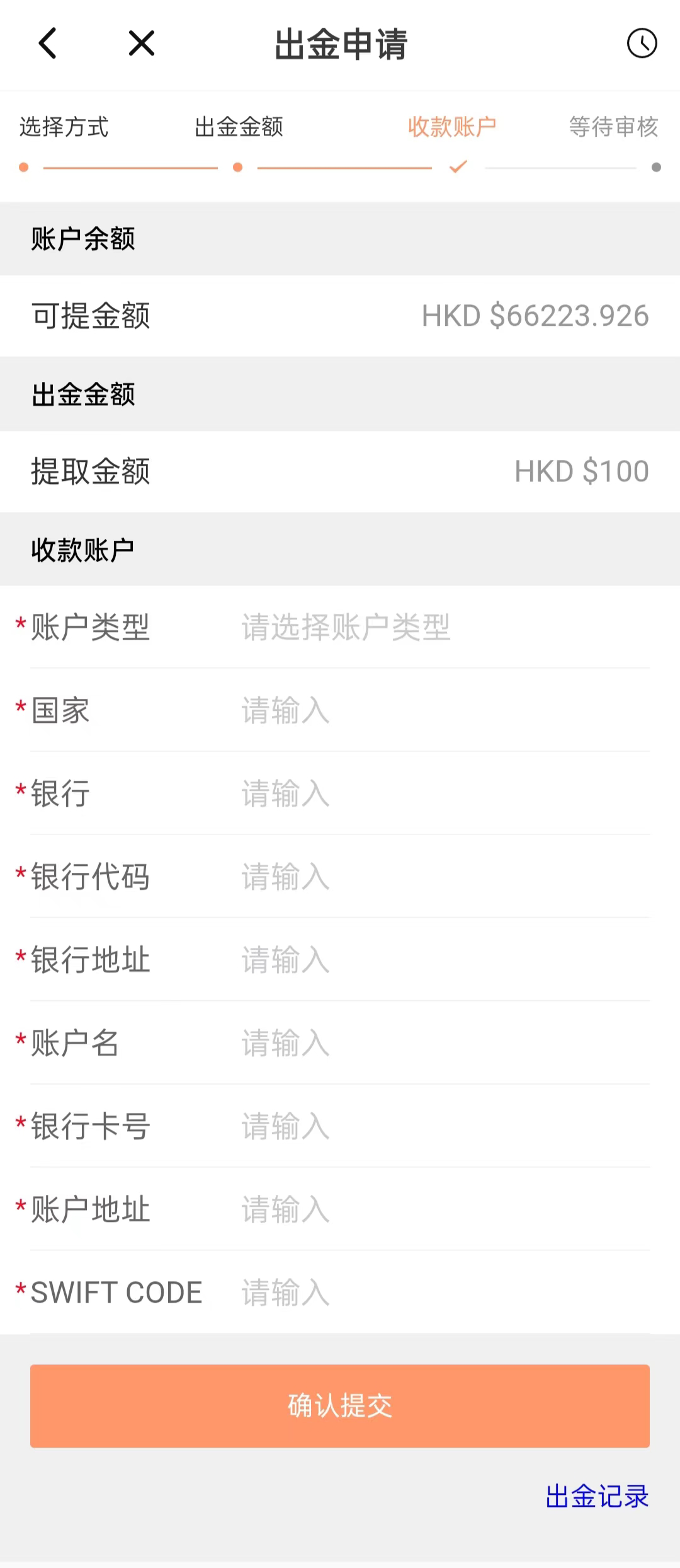 1.点击出金申请页面右上方按钮可查看您的出金进程。